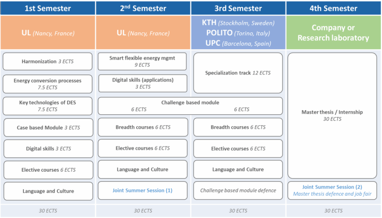 Two joint summer sessions will be organized over the two years, one during the 1st year and one during the 2nd year. These summer schools will be the opportunity to deepen topics, like entrepreneurship and finance in the energy field (in ESADE Barcelona), hydrogen energy (UL, Nancy), power-to-X energy storage (PoliTo, Turin) and energy systems modelling (KTH, Stockholm). During the summer schools, students will have the opportunity to meet industrial and societal actors: lectures and industry and energy site visits will be proposed.