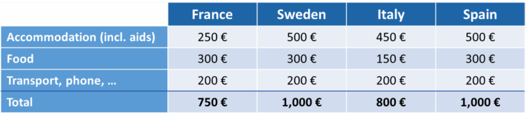 Here is a breakdown of the minimal monthly cost of living in each country of the program.